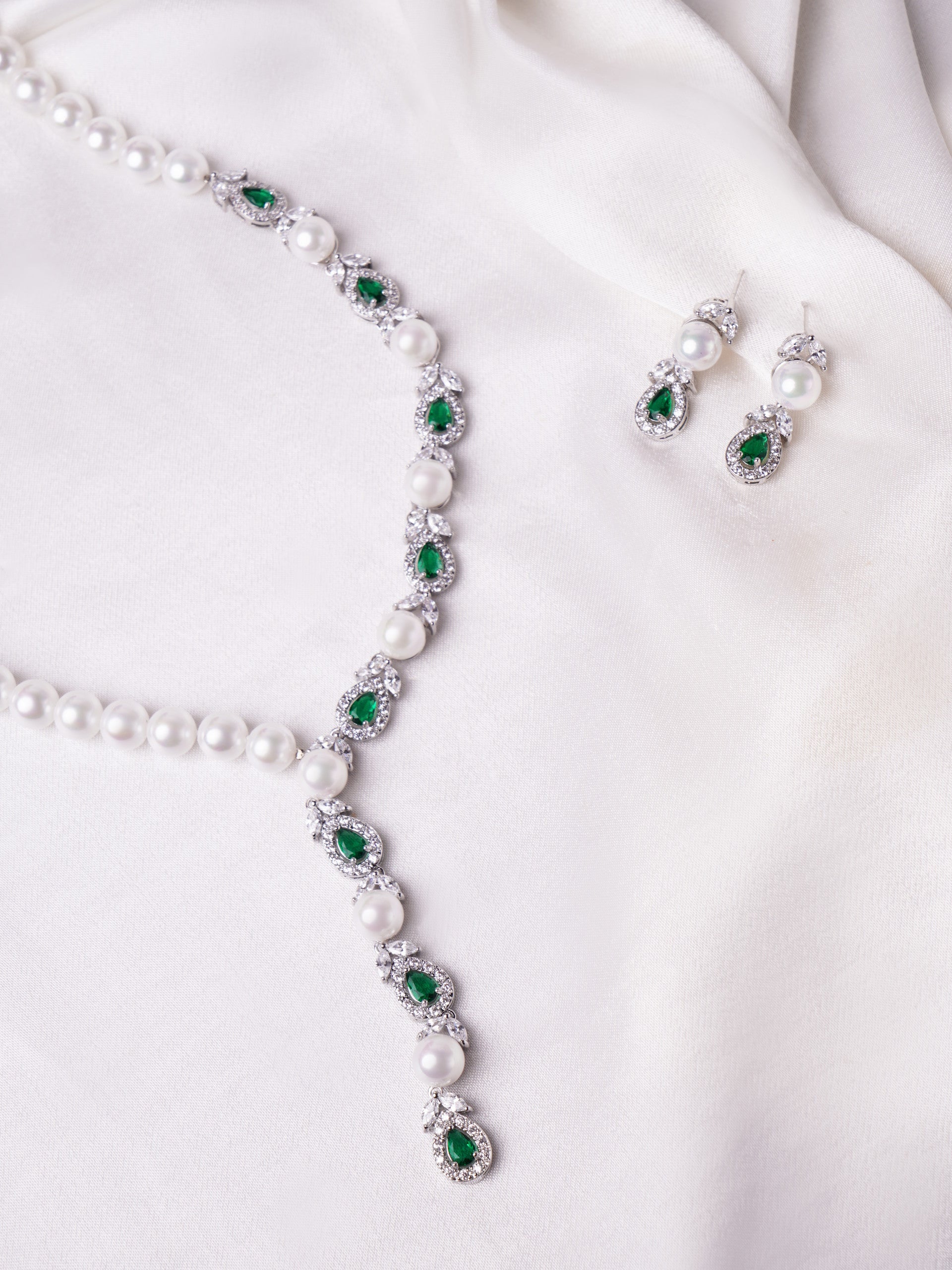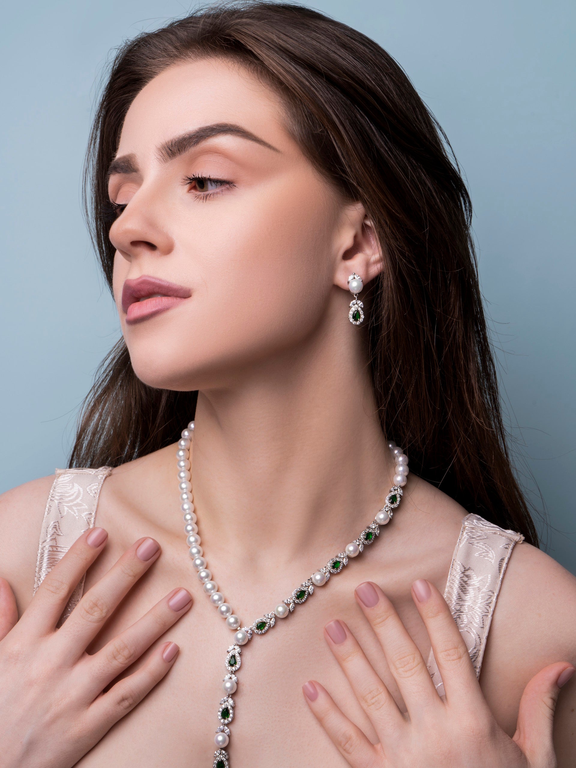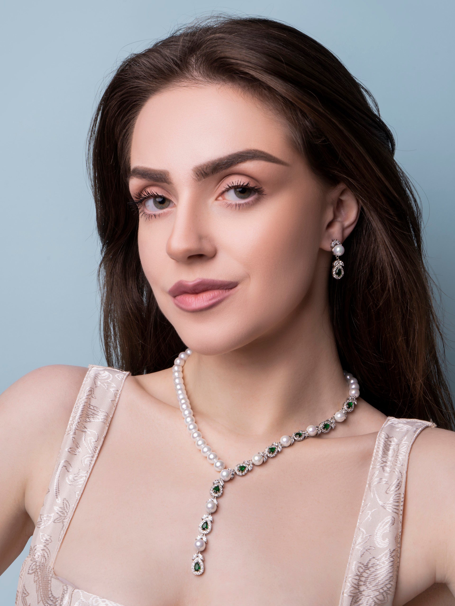 The SOHO SET includes a matching necklace and earrings featuring elegant decorated pearls paired with sparkling green zircon stones. This combination offers a refined and radiant look, perfect to uplift your style with a touch of sophistication and charm for any special moment.
