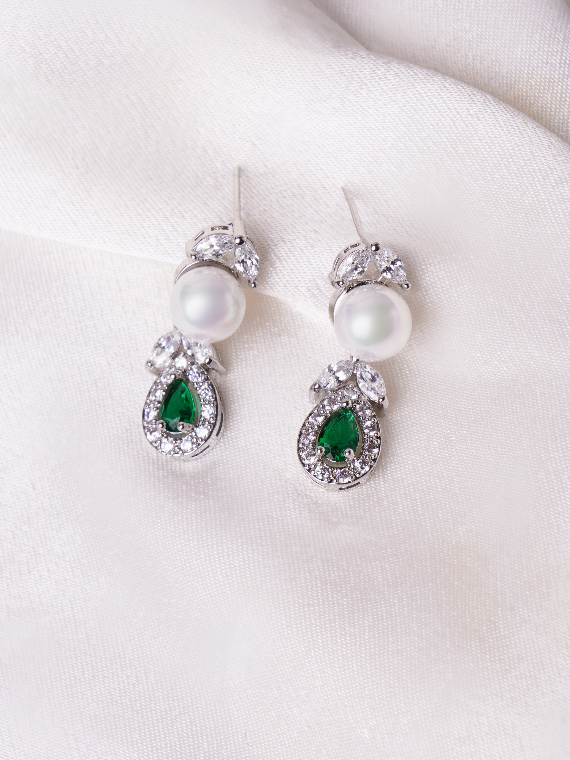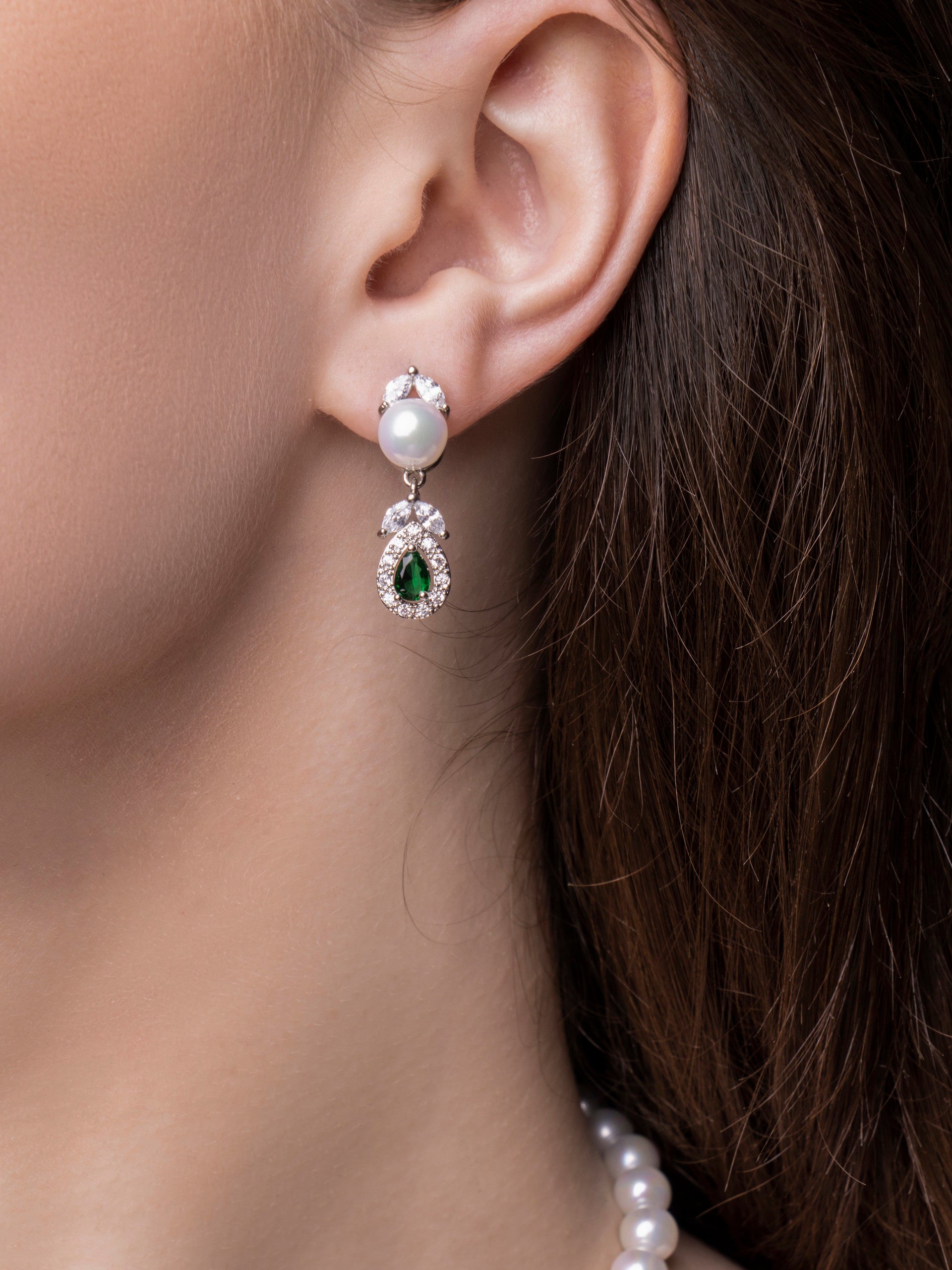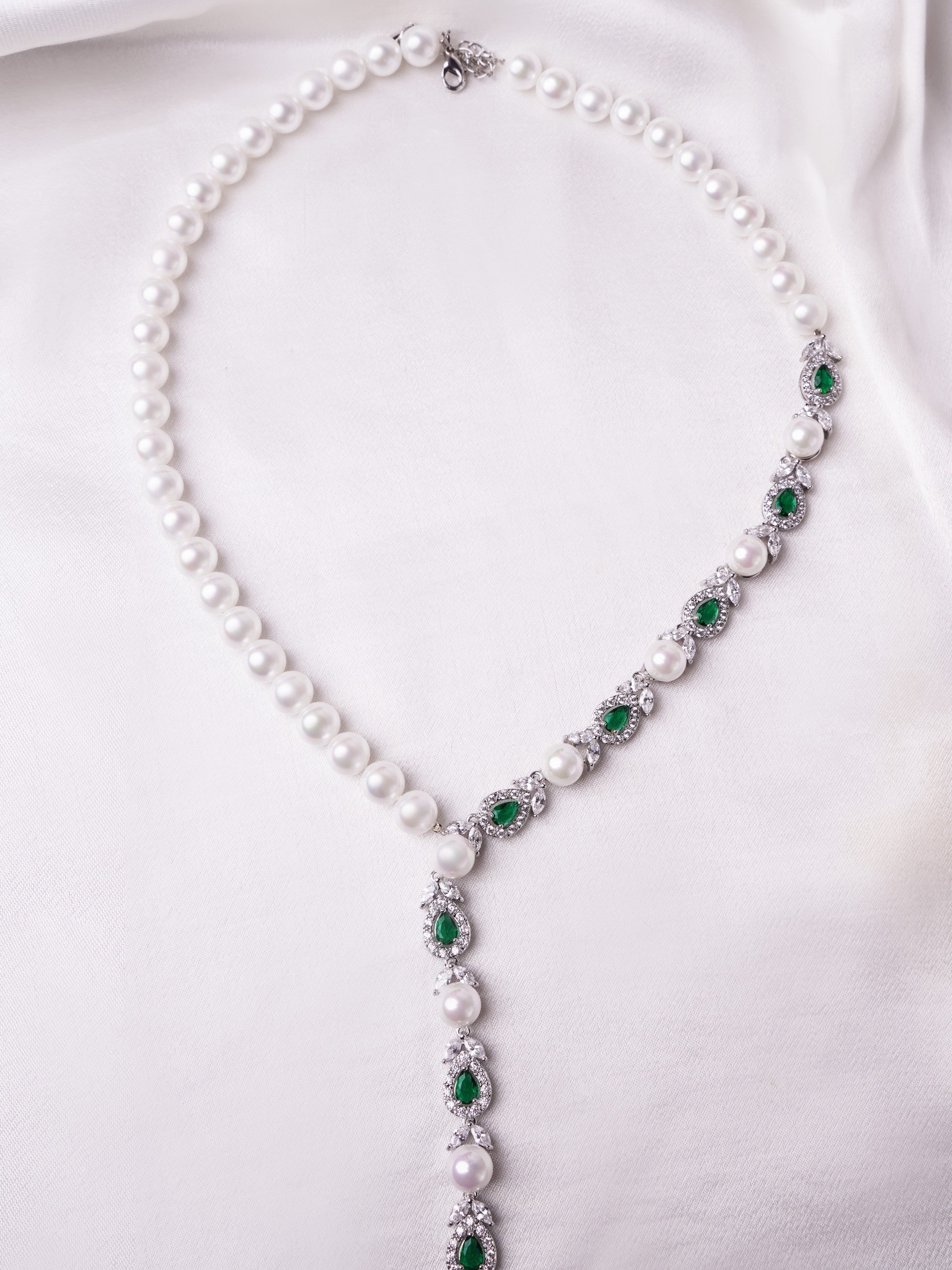 The SOHO SET includes a matching necklace and earrings featuring elegant decorated pearls paired with sparkling green zircon stones. This combination offers a refined and radiant look, perfect to uplift your style with a touch of sophistication and charm for any special moment.