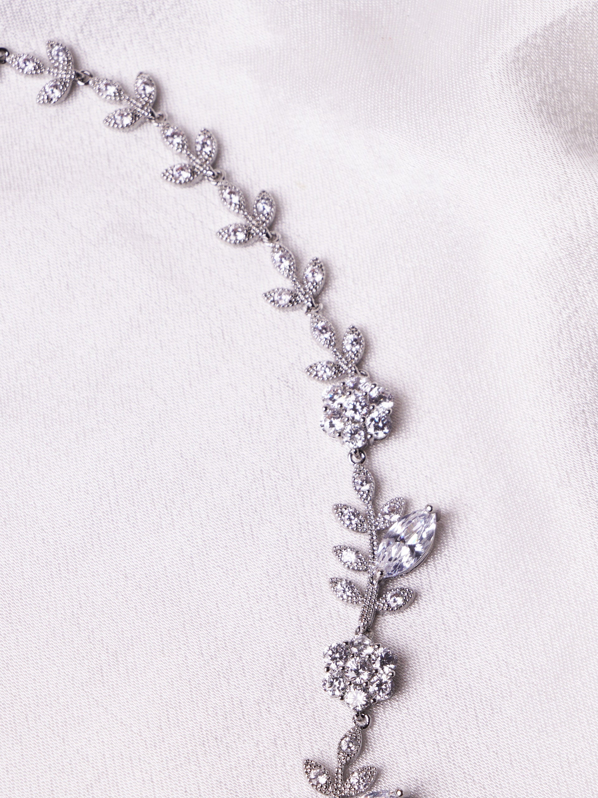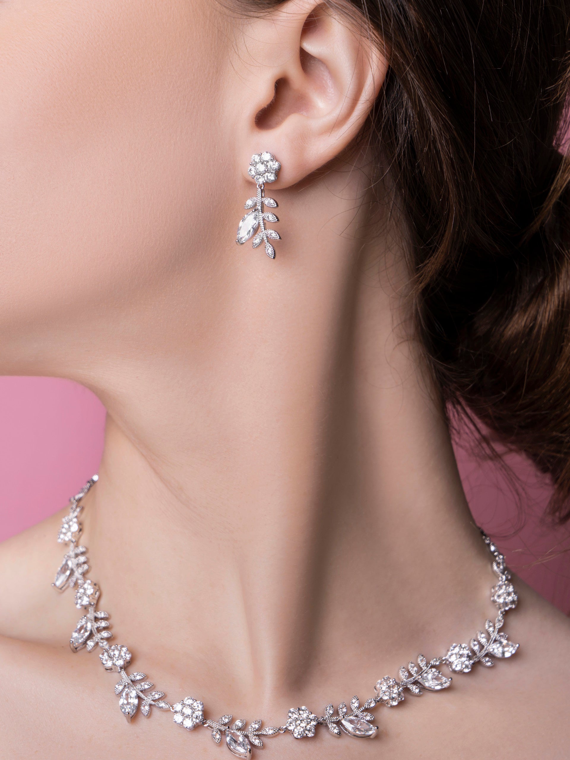 The Zulya Set showcases a stylish flower-inspired design, beautifully accented with shimmering cubic zirconia stones. This elegant necklace and earring combination adds a delicate, radiant touch to any look, perfect for making a graceful statement at special events or enhancing your everyday style. Embrace feminine sophistication with the Zulya Set.