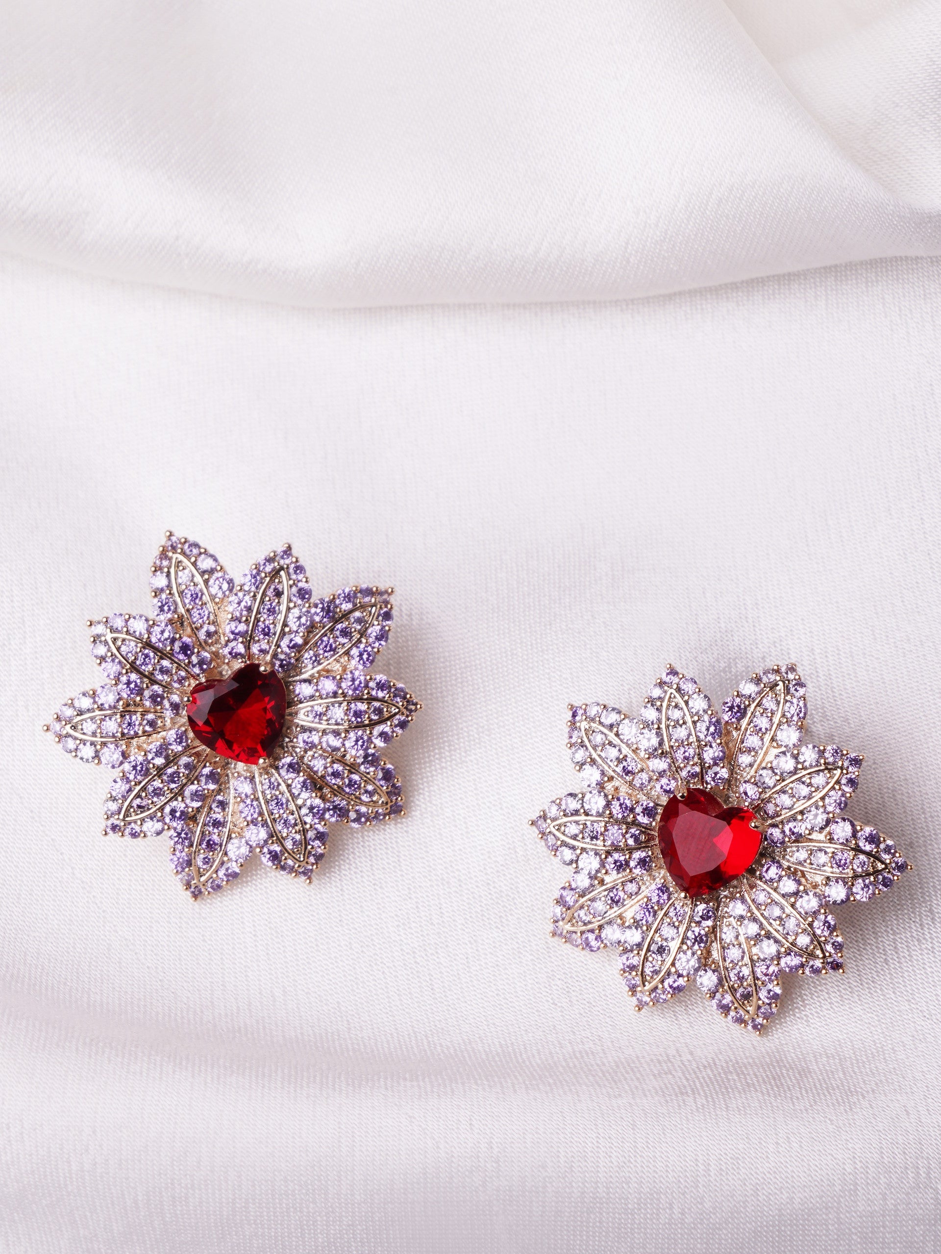 These delicate earrings draw inspiration from the natural beauty of a flower, featuring a warm purple setting that gracefully surrounds a vibrant red stone at the center. The combination evokes a sense of elegance and warmth, making them a thoughtful accessory to brighten your day and complement any outfit with a touch of nature’s charm.
