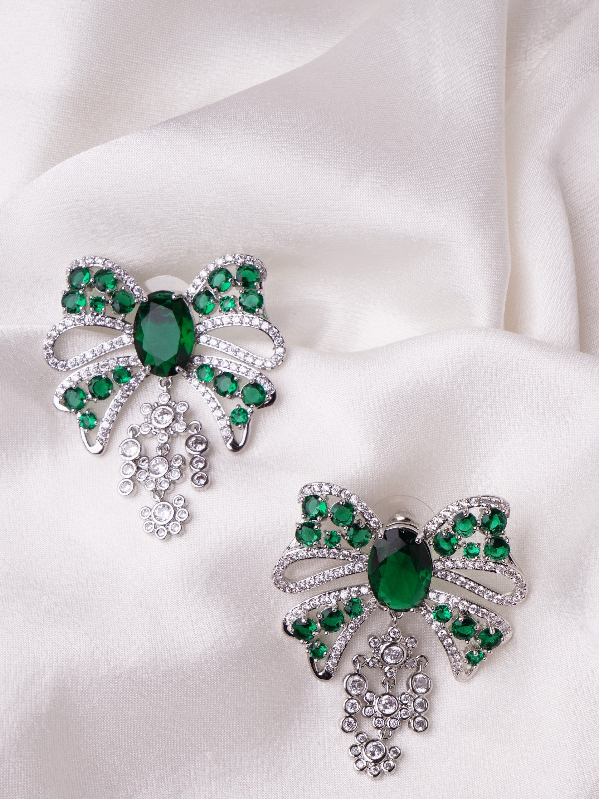 The Lunar Green Earring is beautifully adorned with premium green zircon stones, showcasing an exquisite luxury design. This elegant piece offers a refined touch to any outfit, providing a subtle yet stunning accent that supports your individual style with grace and confidence.
